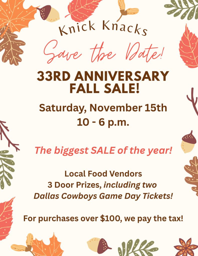 Knick Knacks opened its doors in November 1992 as an antique and craft mall by Sam and Kathy Jones. Their son Bryan Jones and his wife took over family business until September 2017 when Knick Knacks was bought by Richard and Sarith Abramowitz. Richard and Sarith are thrilled to continuing the legacy, and building upon the success, of the Jones Family.